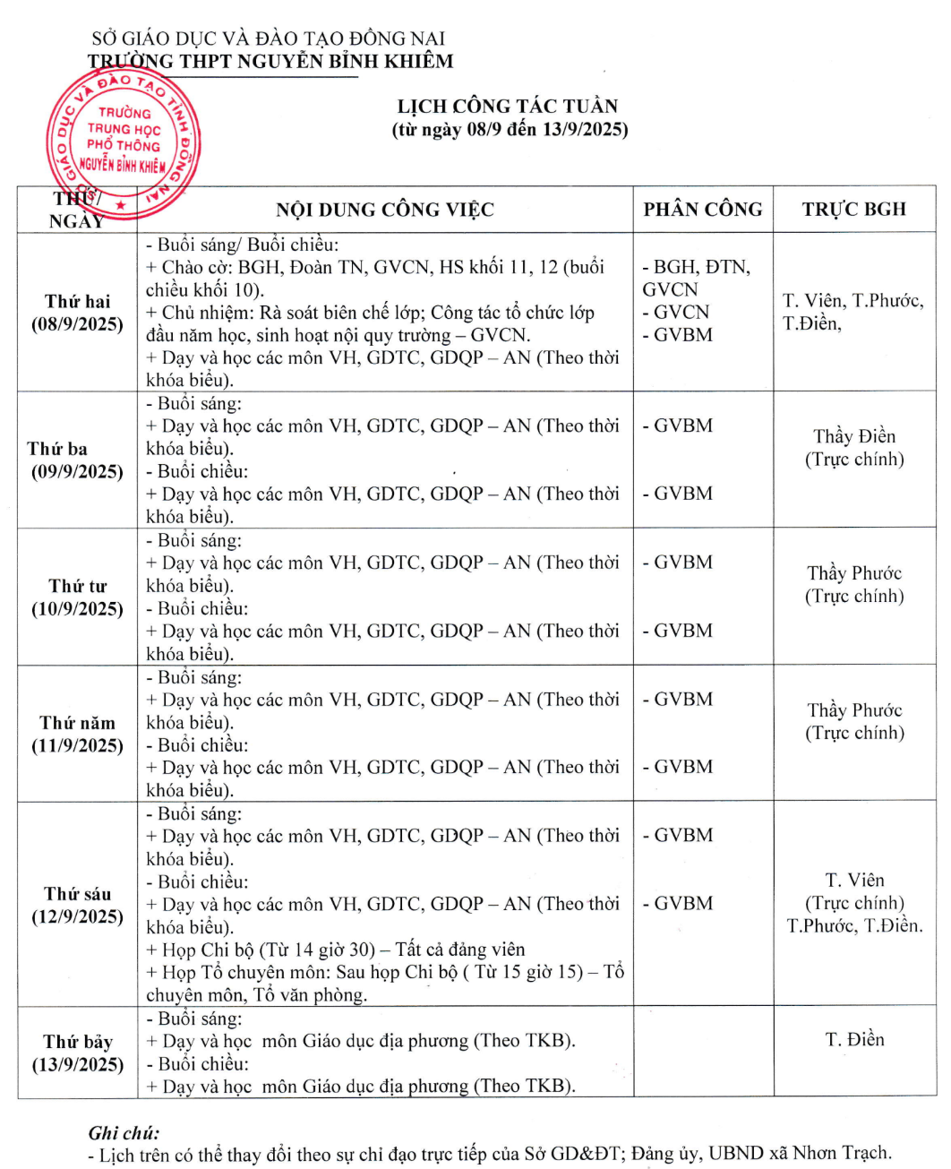 Lịch công tác tuần 1 (8/9/2025-13/9/2025)